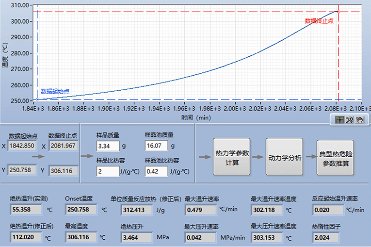 • 测量物质分解放热的起始温度、绝热温升、温升速率等